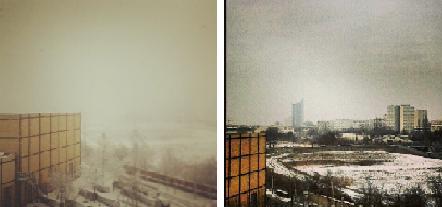 Das Schneetreiben hat die Leipziger Stadtansicht verschwinden lassen. Das linke Foto entstand heute, das rechte Foto vor fünf Tagen.